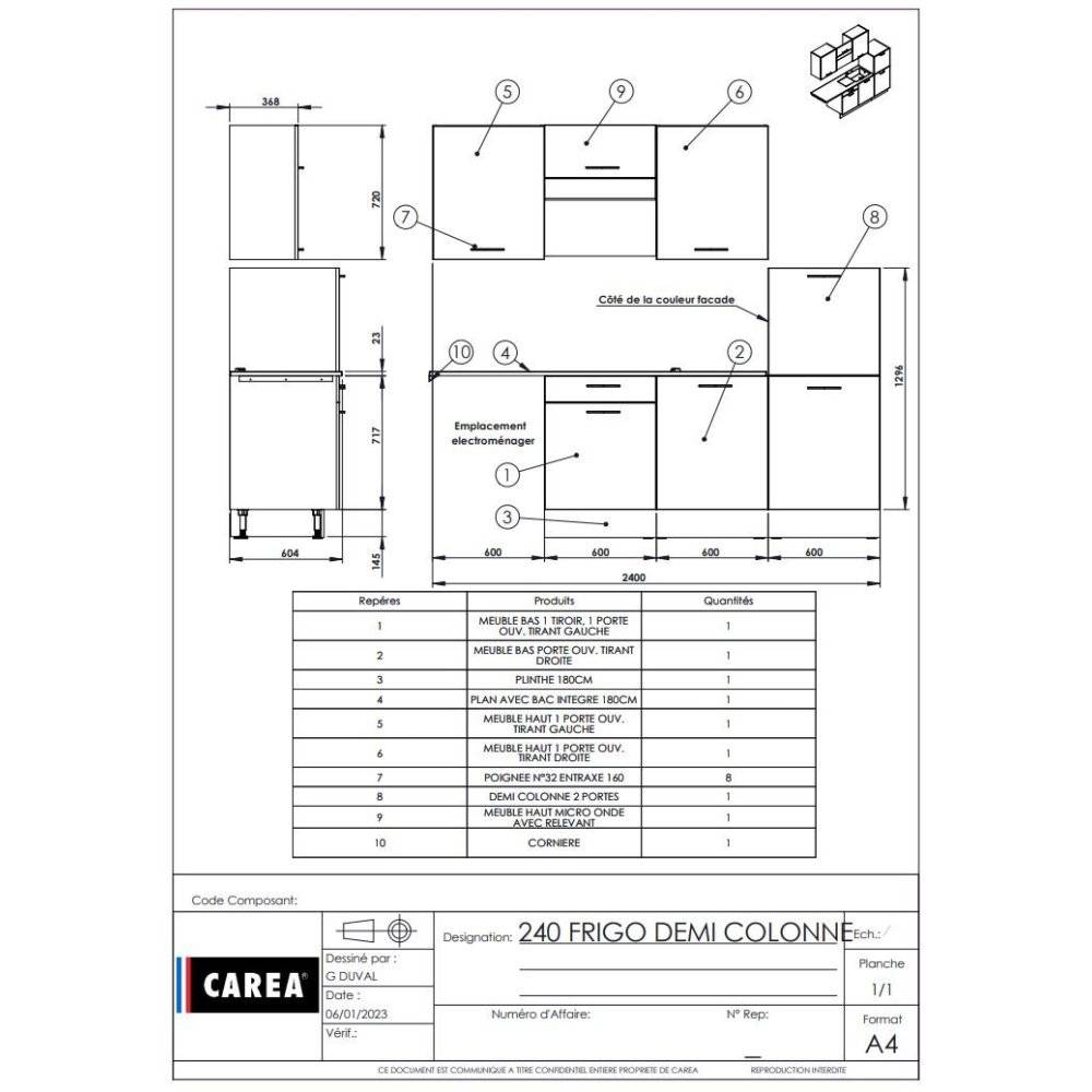 *Estimation réalisée par un monteur professionnel. Les meubles arrivent chez vous déjà montés (portes et tiroirs inclus). Le plan de cuisine avec bac est prêt à poser. Il ne vous reste qu'à clipser les pieds et à visser les poignées (gabarit de pose inclus);** Le livreur se présentera au pas de votre porte ou au pied de votre immeuble, il ne rentrera pas dans votre domicile (ni dans le hall de votre immeuble). Les meubles et les plans étant lourds et volumineux, nous vous invitons à prendre des précautions pour l'organisation et la manipulation des colis.*** La véritable couleur de nos produits peut être légèrement différente de la couleur présentée sur le site internet. Échantillons produits disponibles sur demande.
