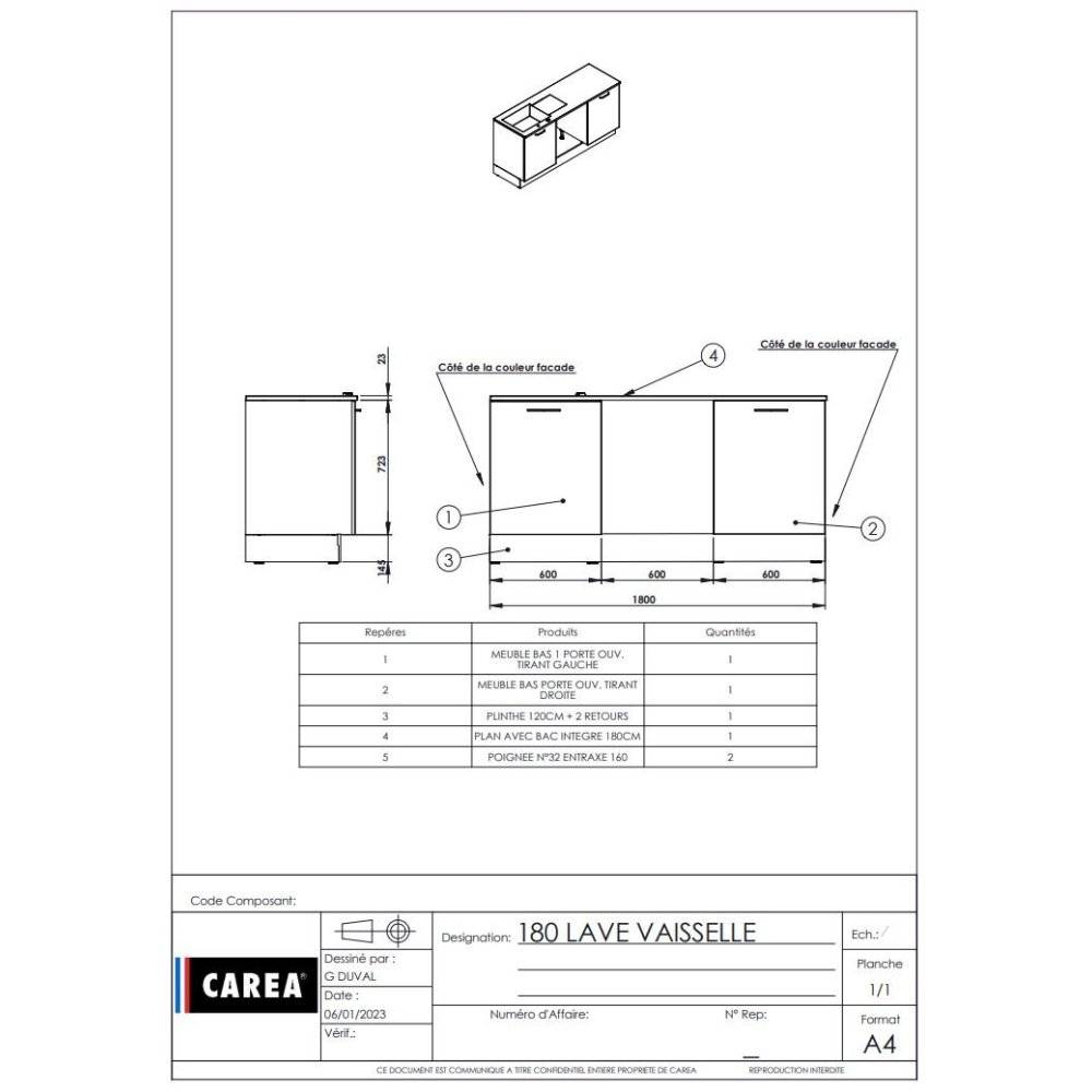 *Estimation réalisée par un monteur professionnel. Les meubles arrivent chez vous déjà montés (portes et tiroirs inclus). Le plan de cuisine avec bac est prêt à poser. Il ne vous reste qu'à clipser les pieds et à visser les poignées (gabarit de pose inclus);** Le livreur se présentera au pas de votre porte ou au pied de votre immeuble, il ne rentrera pas dans votre domicile (ni dans le hall de votre immeuble). Les meubles et les plans étant lourds et volumineux, nous vous invitons à prendre des précautions pour l'organisation et la manipulation des colis.*** La véritable couleur de nos produits peut être légèrement différente de la couleur présentée sur le site internet. Échantillons produits disponibles sur demande.