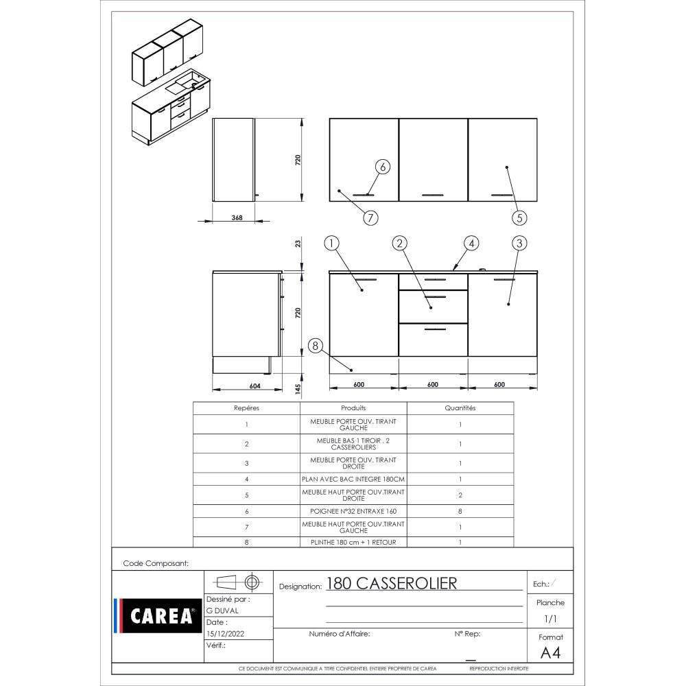 *Estimation réalisée par un monteur professionnel. Les meubles arrivent chez vous déjà montés (portes et tiroirs inclus). Le plan de cuisine avec bac est prêt à poser. Il ne vous reste qu'à clipser les pieds et à visser les poignées (gabarit de pose inclus);** Le livreur se présentera au pas de votre porte ou au pied de votre immeuble, il ne rentrera pas dans votre domicile (ni dans le hall de votre immeuble). Les meubles et les plans étant lourds et volumineux, nous vous invitons à prendre des précautions pour l'organisation et la manipulation des colis.*** La véritable couleur de nos produits peut être légèrement différente de la couleur présentée sur le site internet. Échantillons produits disponibles sur demande.
