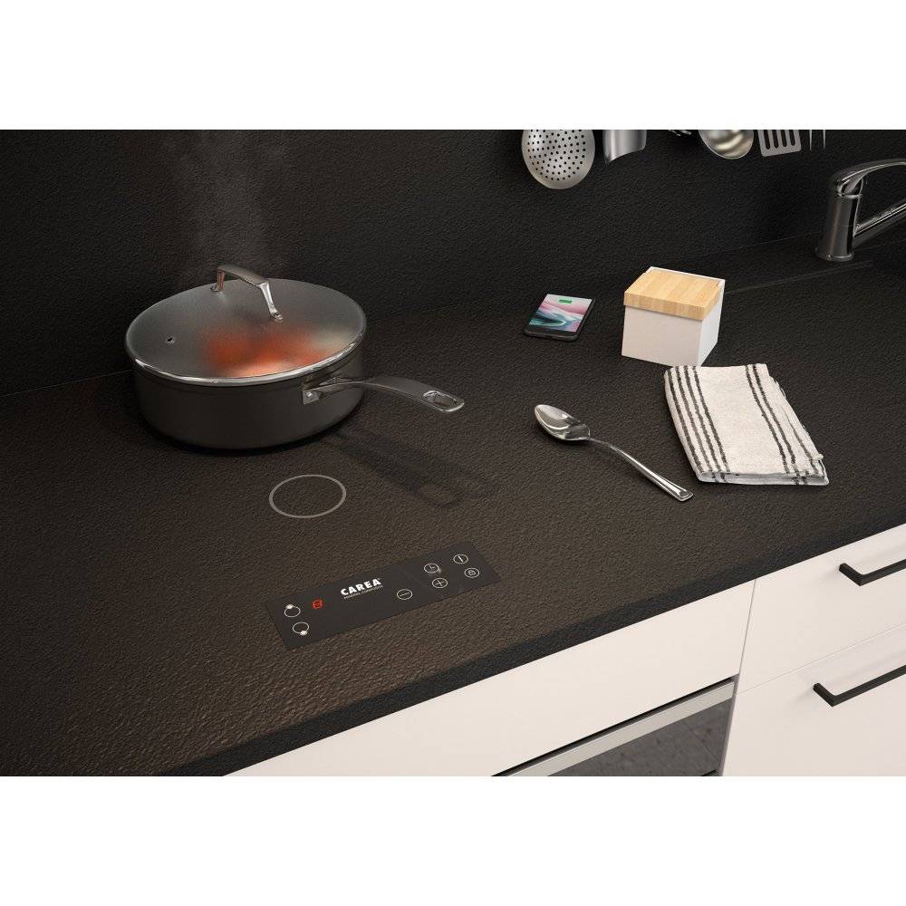 Votre plaque de cuisson est visible par la commande CAREA et les repérages de zone d'induction. Posez votre dessous de plat et votre casserole sur le plan, mettez en fonctionnement... et votre cuisson est lancée.
